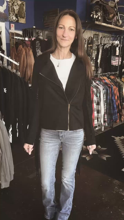 Buttery soft, suede-like Moto Jacket with side and back fringe, front zipper and cross stitched detailing